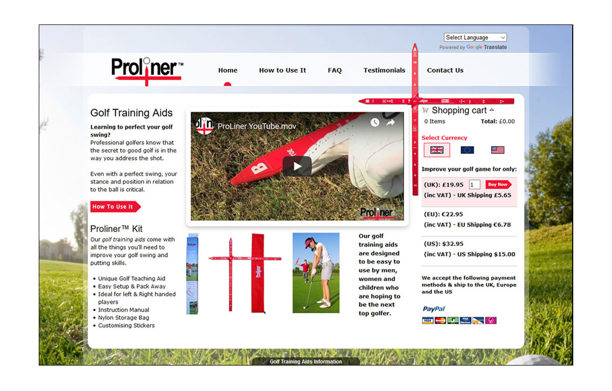 We created a bright and colourful UI design for Proliner Golf which incorporated the company's main product within the navigation and pay layout. The main focal point is the product and it's promo video.